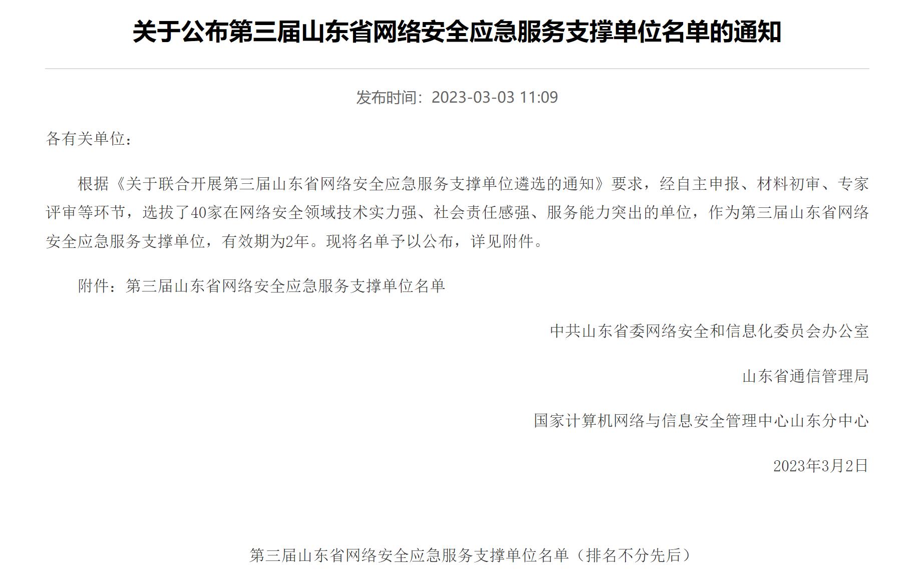 “山东省网络安全应急服务支撑单位”旨在遴选出网络安全领域技术实力强、社会责任感强、服务能力突出的单位,加强我省网络安全保障体系建设,提升网络安全事件应急处置能力。