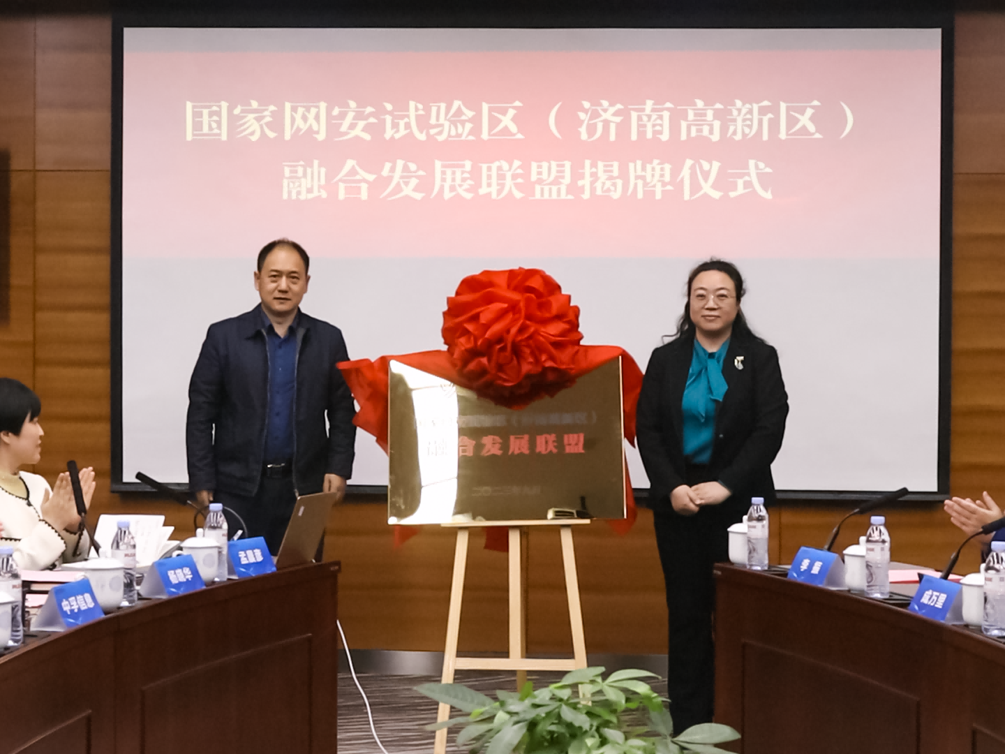联盟成立大会现场,济南高新区党工委委员、管委会副主任,国家信息通信国际创新园服务中心党组副书记、副主任陈安彪介绍网安试验区建设进展;省委网信办网络安全协调处处长刘春波、市委网信办副主任韩霞共同为联盟揭牌;济南市工信局副局长王冲鶄,国家信息通信国际创新园服务中心副主任、齐鲁软件园发展中心主任李凯分别为理事长单位副理事长单位授牌。