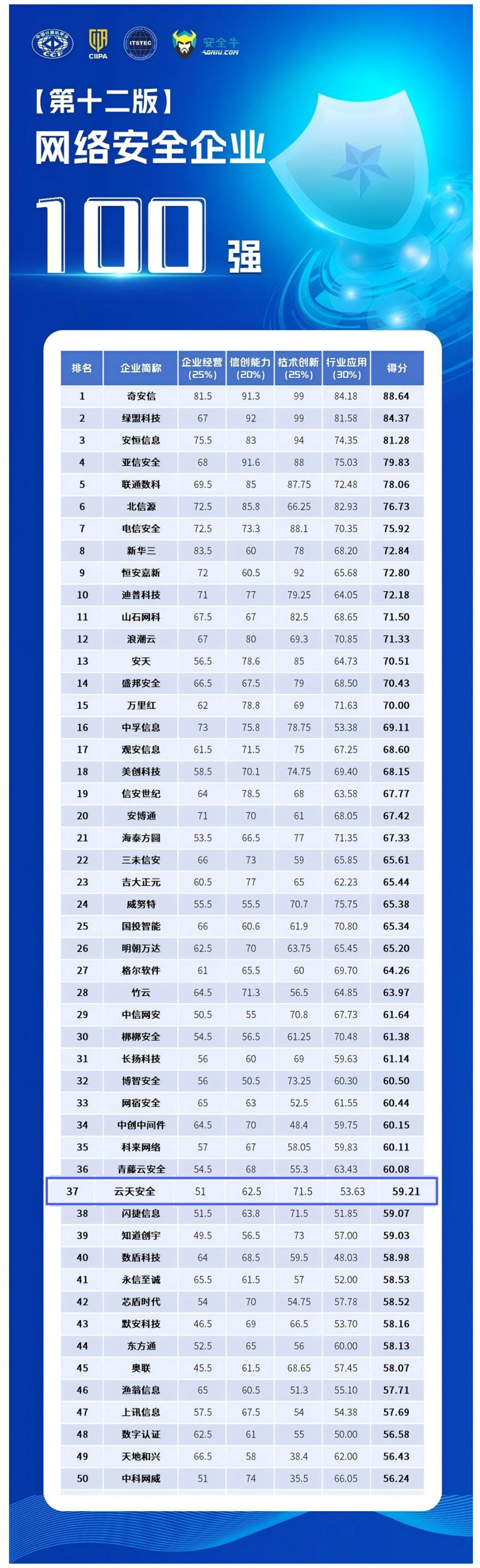 近日,中国计算机学会(CCF)抗恶劣环境计算机专委会、中关村华安关键信息基础设施安全保护联盟、信息产业信息安全测评中心、安全牛联合发布第十二版《网络安全企业100强》。十大外围足彩网安全凭借在企业经营管理、科研技术创新、行业应用案例、信创能力建设等方面的卓越表现,再次入选全国百强榜单,并荣升至第37位。这一成绩标志着十大外围足彩网安全在行业中的地位不断提升,也进一步证明了我们在网络安全领域的技术创新、市场竞争力以及行业影响力。
