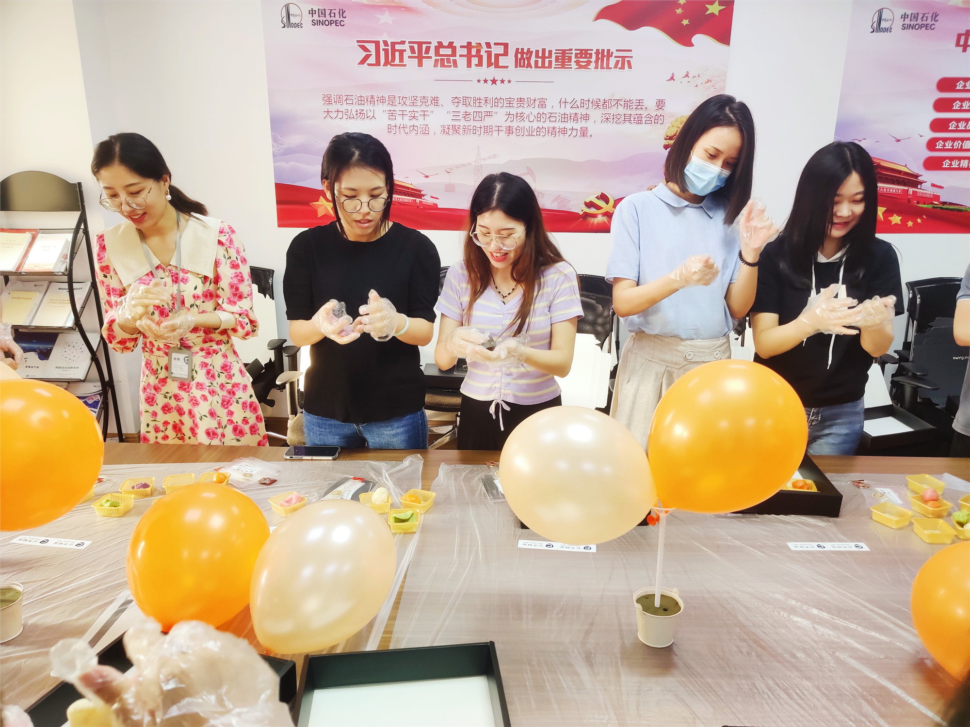活动开始前,综合管理部的同事就早早的布置好了活动现场,并且准备好了制作月饼的面团、馅料、模子等材料。随后,面点老师开始讲解示范制作月饼的流程方法:揉皮、包馅、压模,在面点老师的指导帮助下,大家按照步骤,把油面用手捏成厚薄均匀的饼状,再把准备好的馅料放进去,包裹然后揉成小圆球,最后用模具把小圆球压成月饼。不一会儿,一个个月饼就成型了,各种颜色、各种口味,忙得不亦乐乎。月饼成型后,再亲手折纸盒,封装,装入手提袋,完成一份精美的月饼礼盒,大家兴奋地拍照留念,互相展示自己的劳动成果,成就感满满,一片其乐融融的景象。