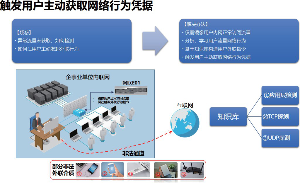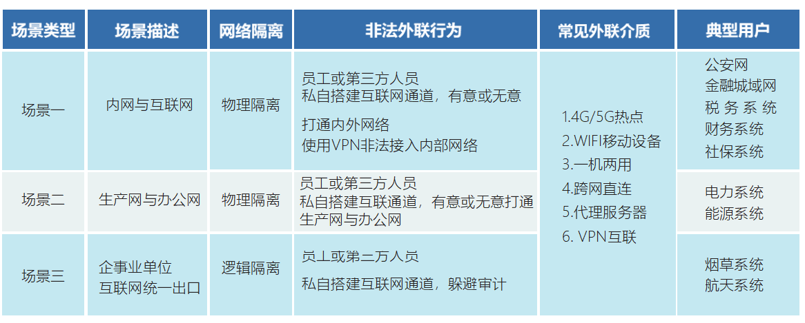 随着信息化网络化的快速发展,关键信息基础设施作为事关国家安全和社会稳定的重要战略资源的地位日益凸显。为了更好地应对威胁关键信息基础设施的网络恶意扫描、入侵等网络攻击事件,贯彻落实《中华人民共和国网络安全法》及《网络安全等级保护条例》中关于提升关键信息基础设施保护的要求, 关键信息基础设施网络运营单位应具备网络边界完整性检查能力,能够对内部网络用户私自联接外部网络的行为进行检查,准确定出位置,并对其进行有效处置。 非法外联通道击碎了网络边界完整性,为此,公安部第一研究所设计研发了“网络违规外联稽查系统” (简称网联E01),改变了传统客户端Agent检查模式,基于内网流量分析监测,即可对用户从”可信域”到“非可信域”非授权行为进行日常化、无感知稽查,可及时发现隐患,防患于未然。