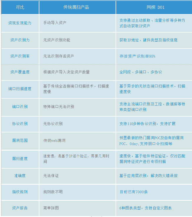 网探D01在全面网络资产识别基础上,重新定义了安全事件处理和漏洞扫描形式,基于漏洞匹配符合特征的 网络资产进行专项扫描,并结合违规外联发现、资产分布统计、安全态势分析等功能,形成集资产探测管理 、安全事件验证、智能统计分析、安全态势感知、持续安全监控为一体的全方位安全体系。