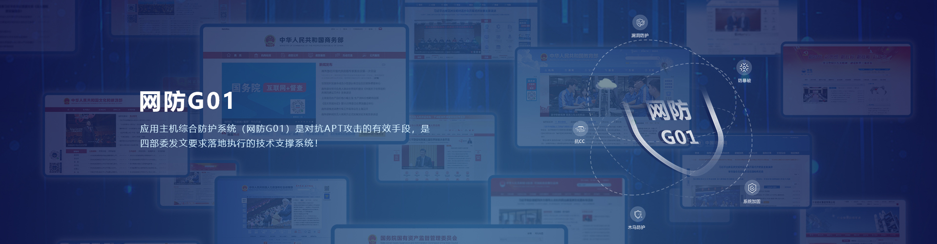 政府网站综合防护系统,现更名为:应用主机综合防护系统《网防G01),该系统通过了公安部计算机信息系统安全产品质量监督检验中心的检测,在“政府网站综合防护系统技术论证会”会议上,以倪光南院士为首的专家组对网防G01高度认可,一致认为“此系统成本低,效果好,可有效的监测和防护针对网站的入侵。建议主管部门将网防G01作为我国网站安全防护的基础设饿大规模推广应用”。