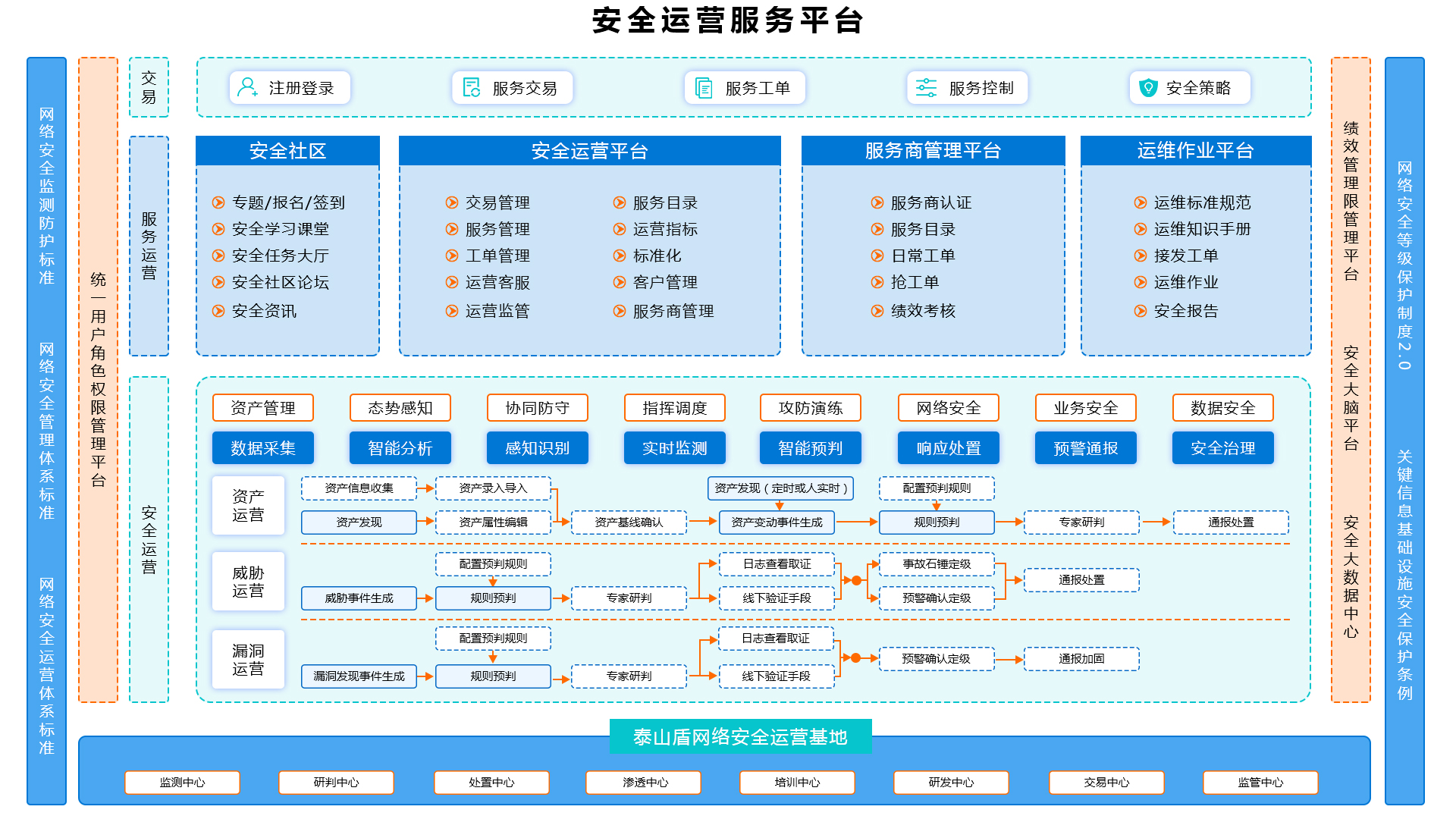泰山盾安全运营平台以安全大数据中心和安全大脑为基础,实现数据采集、智能分析、感知识别、实时监测、智能预判、响应处置、预警通报和安全治理等实现资产管理、态势感知、系统防守、指挥调度、攻防演练、网络安全、业务安全和数据安全等安全运营,基于安全交易平台场景的服务交易、安全社区、服务商管理平台、运维作业平台和安全运营管理平台服务运营,形成具有安全服务交易、数据综合治理及综合安全事件管控能力的安全管理平台。平台利用多种威胁监测技术、大数据关联分析及机器学习技术,配合国家威胁情报数据服务,对其重要关键信息基础设施进行全面的画像、风险检测、攻击溯源,深度描述在网络安全层面上的人、物、地、事以及关联关系的数据态势。实现了对安全事件的事前预警、事中发现、事后回溯、预警通报等。从全局上建设网络安全管理闭环。